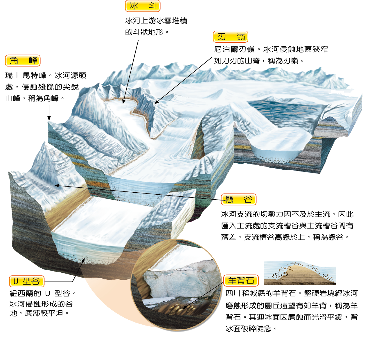 • 同稱:「槽谷」、「U型谷」、「冰川槽谷」、「冰川谷」。 冰蝕地形之一。 由冰川侵蝕而成的谷地,橫剖面呈U形。 特徵是有近於平直的通道和明顯的谷肩(谷坡上部明顯的小平台)。 與一般河谷恰好相反,槽谷的谷底寬度自上游到下游由寬變窄。 下圖為:冰蝕地形示意圖。