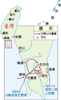 1874年,日本以琉球船隻漂至臺灣南部且部分人員遭原住民殺害為由,派兵侵臺。