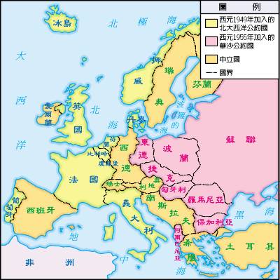 北大西洋公約的出現引起了蘇聯的緊戒,遂也於西元1955年召集東歐諸國簽署《華沙公約》,成立華沙公約組織(Warsaw Treaty Organization)用以抵禦