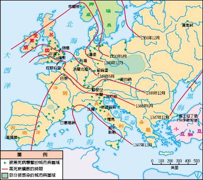 下圖為黑死病傳播示意圖